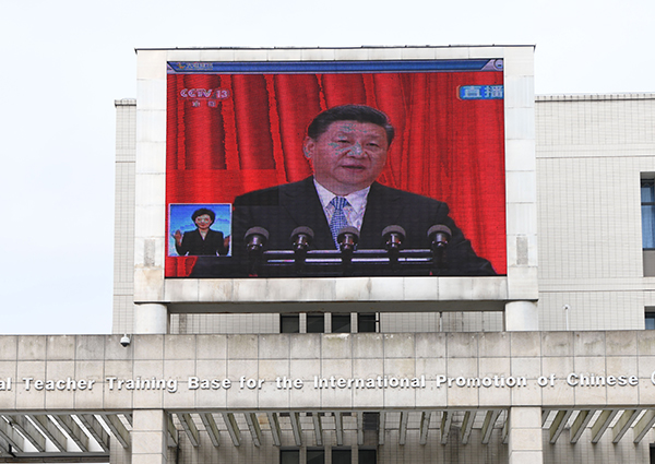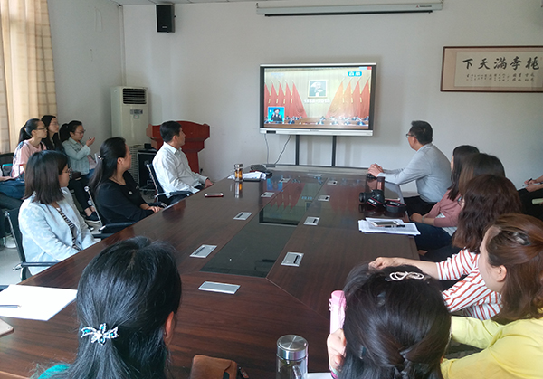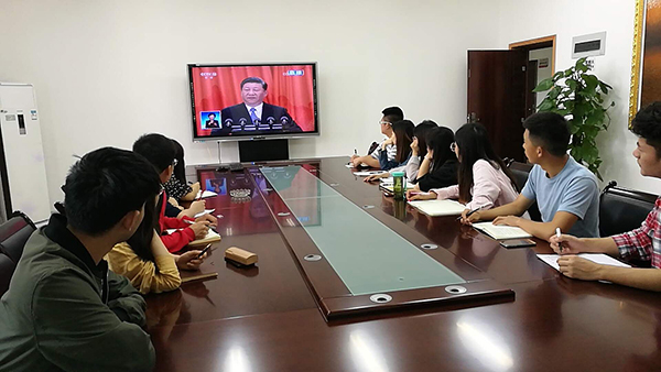 我校黨委中心組在綜合行政樓309會議室集中收看了大會現場直播。中心組成員們認真聆聽習近平總書記在大會上發表的重要講話,就相關重點內容進行了深入交流討論。全校各二級基層黨組織、各學院也分別組織教職工、學生黨員及入黨積極分子、青馬學員集中觀看大會盛況。校黨委宣傳部利用演播大廳、圖書館廣場大屏幕、大型會議室等,持續播放大會直播視頻,營造熱烈的校園學習氛圍。