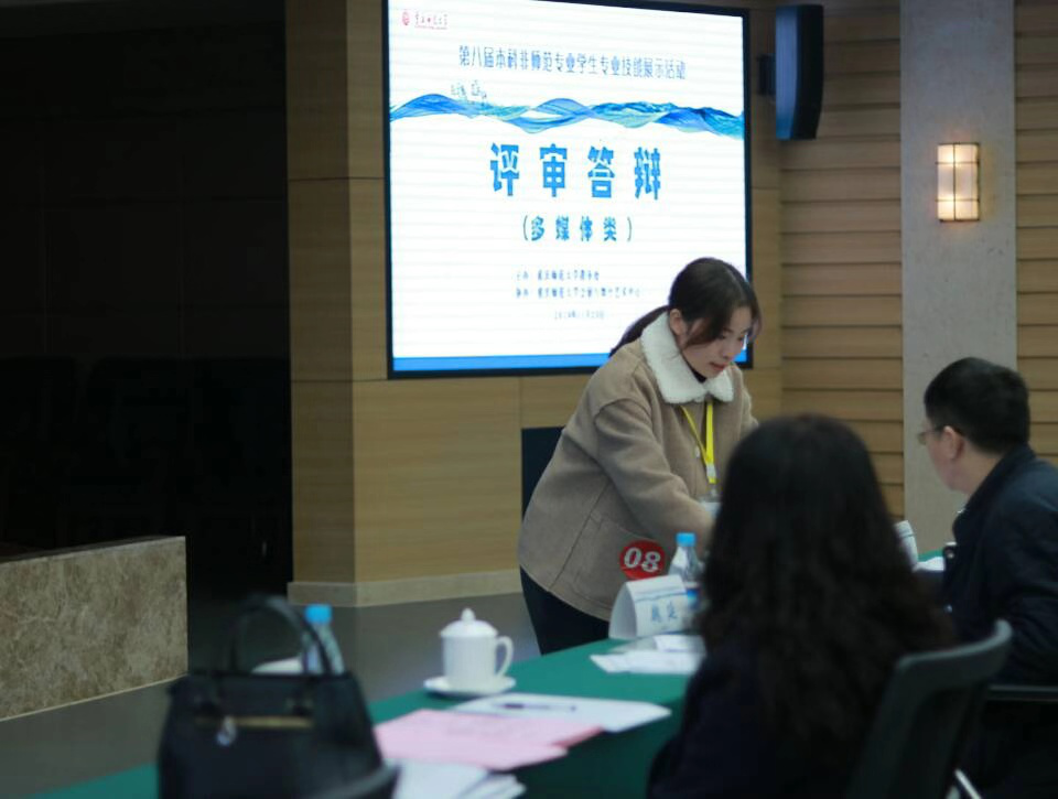 11月23日下午,我校第八屆非師范專業(yè)學(xué)生專業(yè)技能展示活動(dòng)的第一階段——參賽作品評(píng)審與答辯在博雅樓5樓舉行。