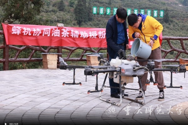 黃敦元團隊主要從事油茶傳粉昆蟲的保護與利用等方面的研究。團隊依托農業農村部長江上游傳粉昆蟲資源保護與利用重點實驗室等省部級科研平臺,研發蜂機協同油茶輔助授粉技術,主要通過油茶花期放養中華蜜蜂為油茶授粉的同時收集中華蜜蜂攜巢花粉,并通過無人機噴施液體花粉輔助油茶授粉,前期在重慶、江西、湖南等地的區域化實驗結果顯示該技術可以提高12%-25%的油茶座果率。