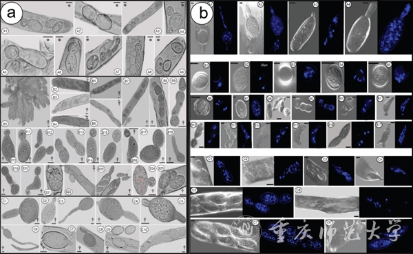 圖2a:秋天羊肚菌子囊孢子萌發和出芽生殖產生分生孢子;圖2b:秋天羊肚菌子囊孢子、芽管和子囊孢子所產生的分生孢子的細胞核狀態。