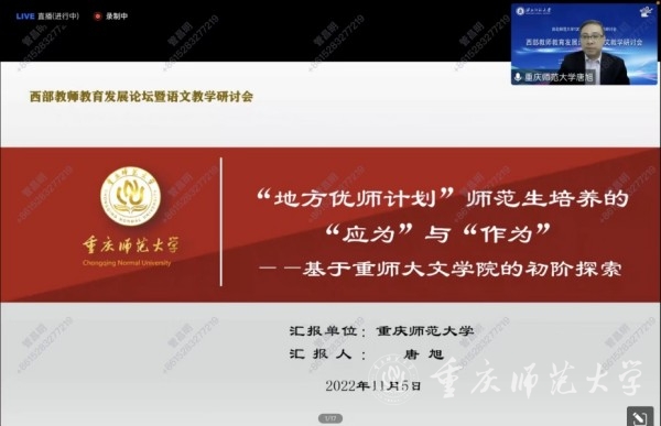 11月5日,由西北師范大學(xué)主辦的“西部教師教育發(fā)展論壇暨語文教學(xué)研討會”以騰訊會議的形式在線上順利舉行。文學(xué)院副教授、漢語言文學(xué)系副主任、碩士生導(dǎo)師唐旭應(yīng)邀參會,并發(fā)表了題為“‘地方優(yōu)師計(jì)劃’師范生培養(yǎng)的‘應(yīng)為’和‘作為’——基于重慶師范大學(xué)文學(xué)院的初階探索”的主題報(bào)告。