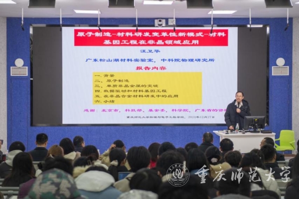 12月27日下午,中國科學院院士、松山湖材料實驗室主任、中國科學院物理研究所汪衛華研究員應物理與電子工程學院邀請到我校作題為“原子制造-材料研發變革性新模式-材料基因工程在非晶領域應用”的學術報告。物理與電子工程學院及相關專業師生參加了講座,報告由物理與電子工程學院院長余鵬教授主持。