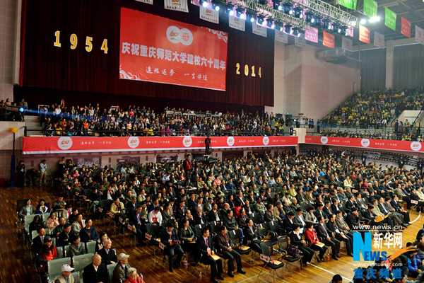 | 10月19日,2000余名重師校友齊聚重慶師范大學虎溪校區,共慶重師60歲生日,圖為紀念大會現場。記者李相博攝 |