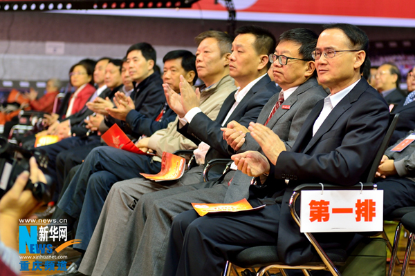 | 10月19日,2000余名重師校友齊聚重慶師范大學虎溪校區,共慶重師60歲生日,圖為全體校領導朗誦《寫給最可愛的人》。記者李相博攝 |