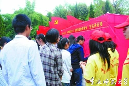 還有1天就是第27屆教師節(jié)了,同湯月一樣,400多名重師的學生冒著綿綿細雨聚集在重師承諾墻前,準備在“向曹瑾校友學習,獻身基礎教育事業(yè)”的簽名板上簽下自己的名字。(《重慶晨報》2011年9月10日A03版)