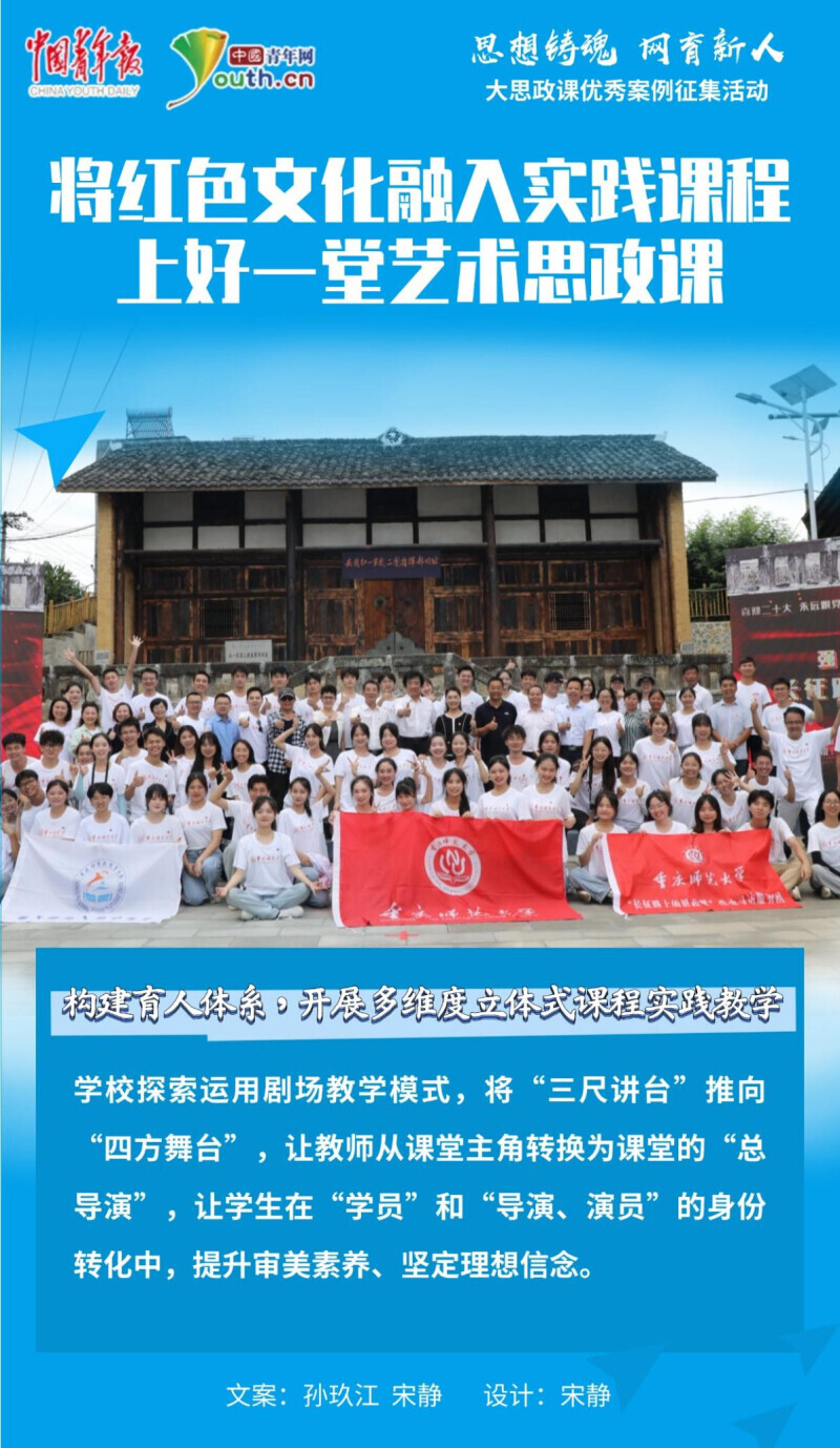 中國青年網北京4月14日電(記者 宋靜)近年來,重慶師范大學以重慶市紅色資源為載體,帶領學生身臨紅色革命教育基地,創(chuàng)作紅色民謠,打造紅色思政課程,將“學校思政小課堂”融入“社會實踐大課堂”,引導廣大師生深入社會實踐,挖掘當地紅色文化資源,將紅色文化貫穿到思政教育的全過程、各環(huán)節(jié),讓紅色文化資源煥發(fā)新活力、創(chuàng)造新價值、賦予新意蘊。