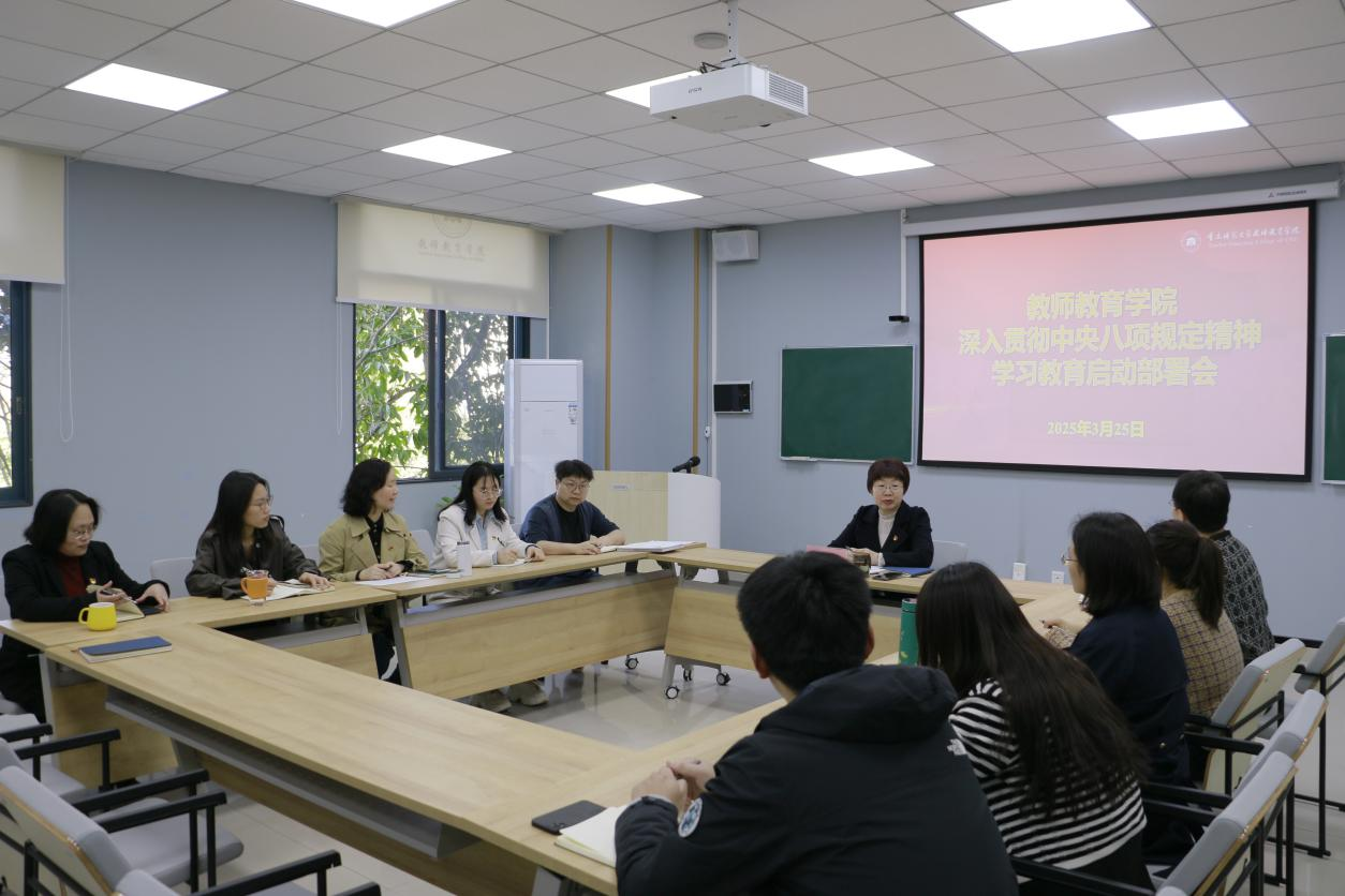 ?3月25日下午,教師教育學(xué)院積極響應(yīng)中共重慶師范大學(xué)委員會(huì)號(hào)召,召開(kāi)深入貫徹中央八項(xiàng)規(guī)定精神學(xué)習(xí)教育啟動(dòng)部署會(huì)。此次會(huì)議旨在全面貫徹落實(shí)黨的二十屆三中全會(huì)部署,鞏固拓展學(xué)習(xí)貫徹習(xí)近平新時(shí)代中國(guó)特色社會(huì)主義思想主題教育成果,深入推進(jìn)作風(fēng)建設(shè)常態(tài)化、長(zhǎng)效化,為學(xué)院發(fā)展提供堅(jiān)強(qiáng)的紀(jì)律保障。會(huì)議由教師教育學(xué)院黨委書(shū)記張紅主持。
