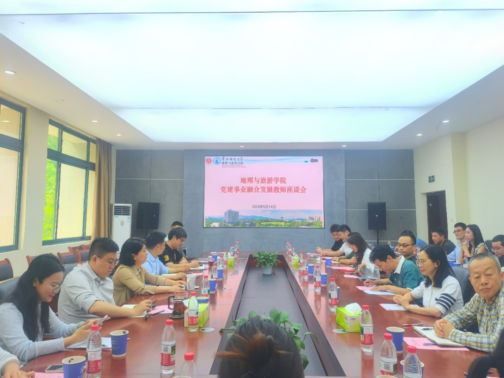 在深入貫徹中央八項規定精神學習教育中,地理與旅游學院按照學校統籌部署,緊密結合黨建與事業“一融雙高”發展任務,鞏固深化黨紀學習教育成果,推進作風建設常態化長效化,2025年5月14日下午,學院在致用樓220會議室召開黨建事業融合發展教師座談會。學院黨政領導班子成員、科級干部、教代會工會代表、院學術與學位委員會成員、系主任代表、校級以上人才和教師代表40余人參會,聚焦學院黨建與事業發展、教師職業發展痛點、學院服務保障優化等議題展開深入探討。會議由學院黨委書記胡芳主持。
